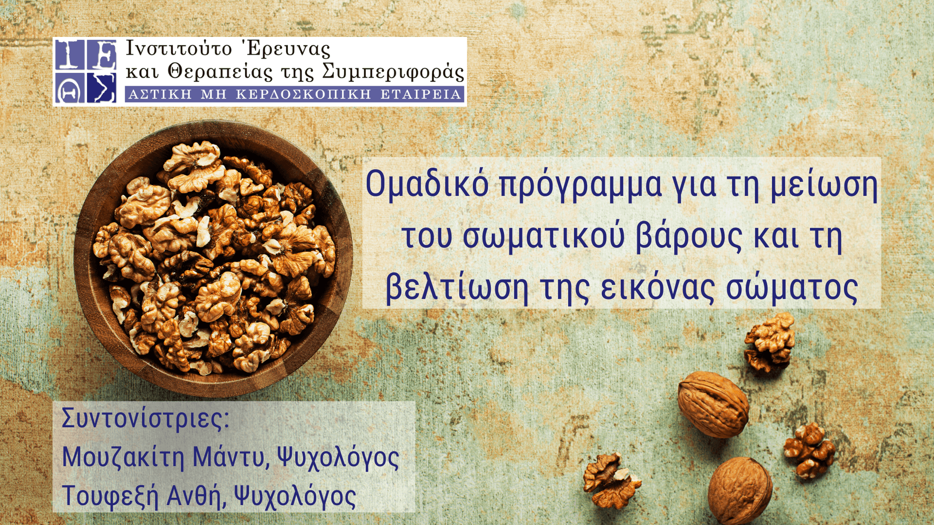 Το Ινστιτούτο Έρευνας και Θεραπείας της Συμπεριφοράς διοργανώνει Ομαδικό Διαδικτυακό Πρόγραμμα για τη Μείωση του Σωματικού Βάρους και τη Βελτίωση της Εικόνας Σώματος με συντονίστριες τις ψυχολόγους Μάντυ Μουζακίτη και Ανθή Τουφεξή και επιστημονικά υπεύθυνη την Δρ. Φωτεινή Λέκκα (https://www.ibrt.gr/weight).